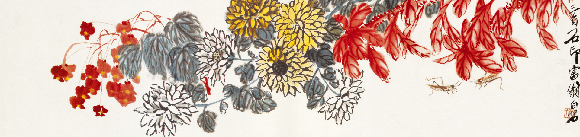 吴昌碩的藝術“畫氣不畫形”“活潑潑地饒精神”,在氣勢的磅礴情感的熱烈、風格的樸拙等方面,與齊白石的書畫創作有不少一致之處,如齊白石自己所說“我們的筆路倒是有些相同的”。但是兩人的藝術淵源有别,文化根基、創作經歷不同,作品的精神境界、審美特色有很大差异。吴昌碩的藝術渾厚、沉鬱、雄闊、樸茂,氣度雍容,包含有更多遠古的文化信息;齊白石的藝術雄强、直率、生辣、恣肆,有着更多執著的生活熱情和民間文化氣息。更概括一點說,在大氣磅礴的共同審美基調之中,吴昌碩的藝術傾向於渾古,齊白石的藝術偏於清逸。