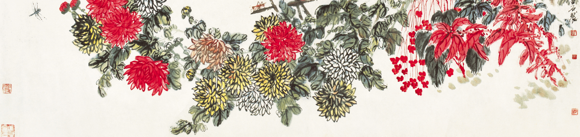 一九五三至一九五四年之際,齊白石為東北博物館和東北美專(今遼寧省博物館、魯迅美術學院)等單位提供了一批很重要的、不同時期的作品,還專門為柬北博物館主辦的齊白石畫展創作了一幅三百九十六厘米長的折枝花卉長卷(一九五四年作),合海棠、荷、菊、牡丹等四時花卉為一卷,自題稱“有解人當知此乃余平生破例也”。還有一套齊白石與其三子良琨合作的草蟲雜畫册,是齊白石晚年極精的花卉作品。齊白石作寫意花卉,齊良琨補蟲。將粗筆寫意花卉與工筆蟲蝶結合於個畫面是齊白石的創造。寫意花卉老筆紛披與工筆蟲豸的精細生動,起着對比與相互襯托的作用,使繪畫形象愈發耐看,然而這種表現手法若施之於其它題材的繪畫創作,其效果却未必佳齊良琨號子如早年隨父學畫,能克紹箕裘。他畫的工筆蝴蝶、螳螂、飛蛾等小蟲,不僅止於精工,而且極富於意態。這套册頁構思構圖多有意外之妙,且有現代感。齊白石的寫意花草落筆突兀、險怪,由於小蟲位置動態恰到好處的安排而化險為夷,平衡了構圖。