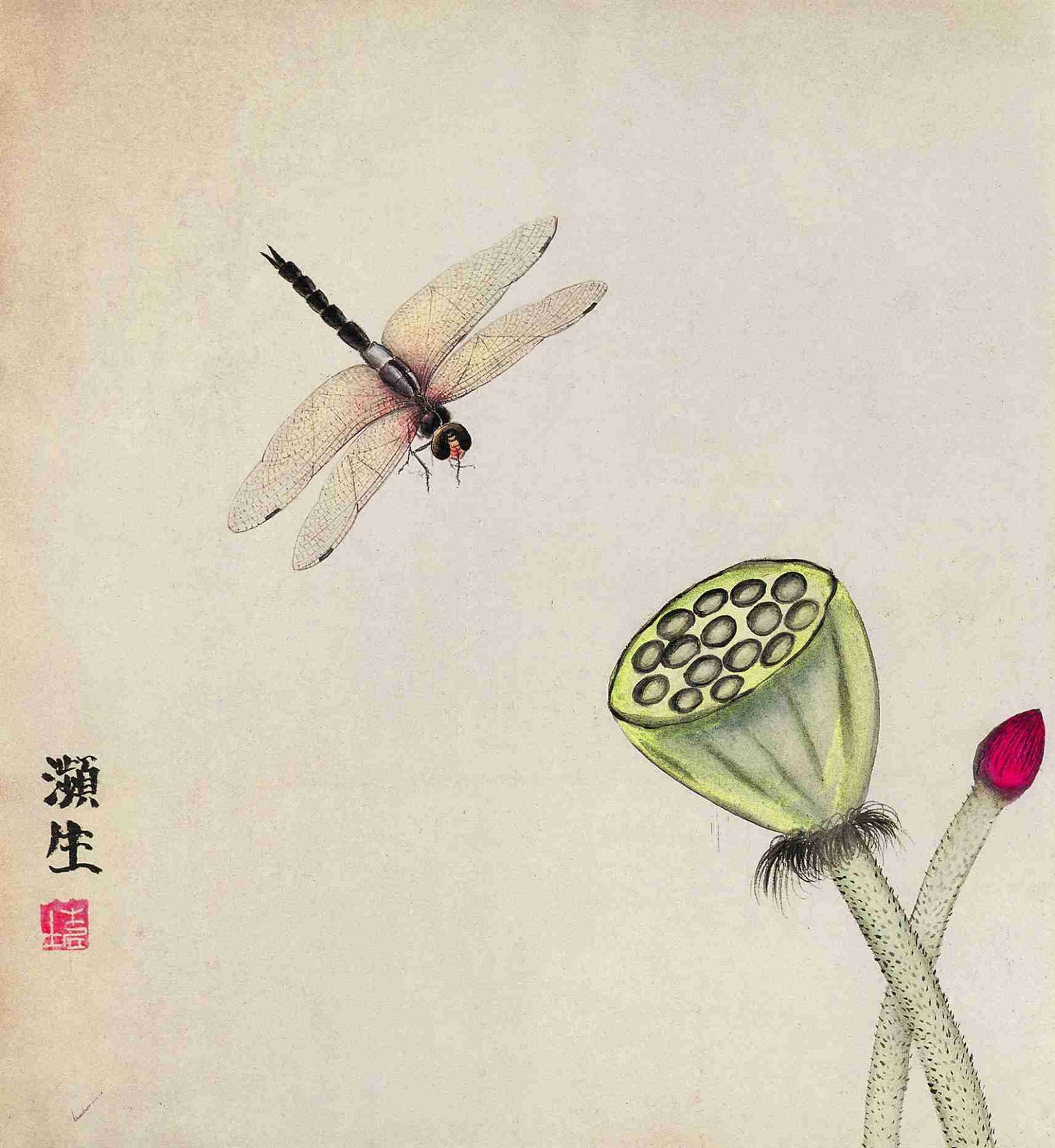 八七 蓮蓬蜻蜓(工筆草蟲册之七)一九〇八—一九〇九年 縱三三點五厘米 横三二點五厘米