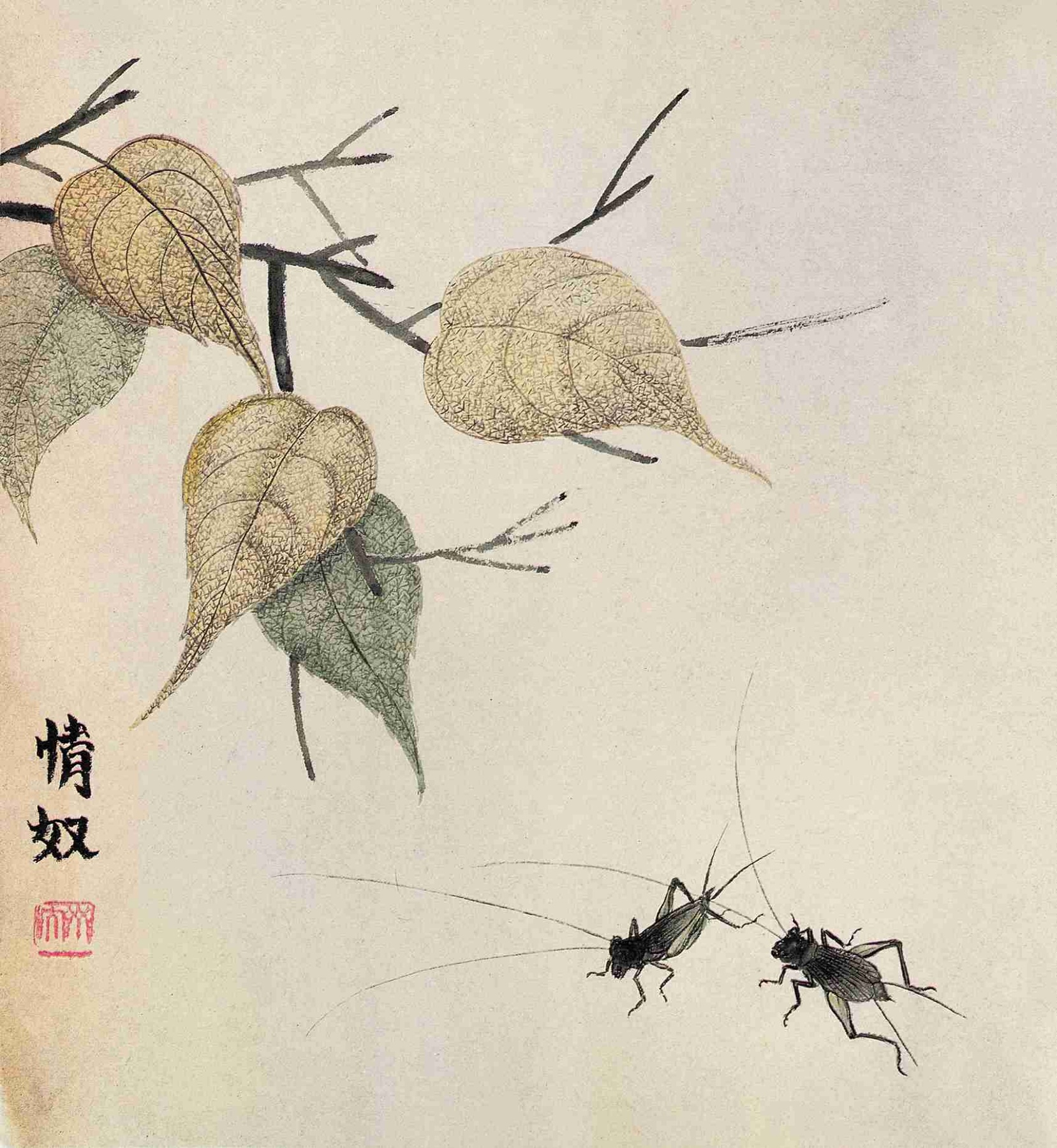 九九 貝葉秋蟲(工筆草蟲册之十九)一九〇八—一九〇九年 縱三三點五厘米 横三二點五厘米