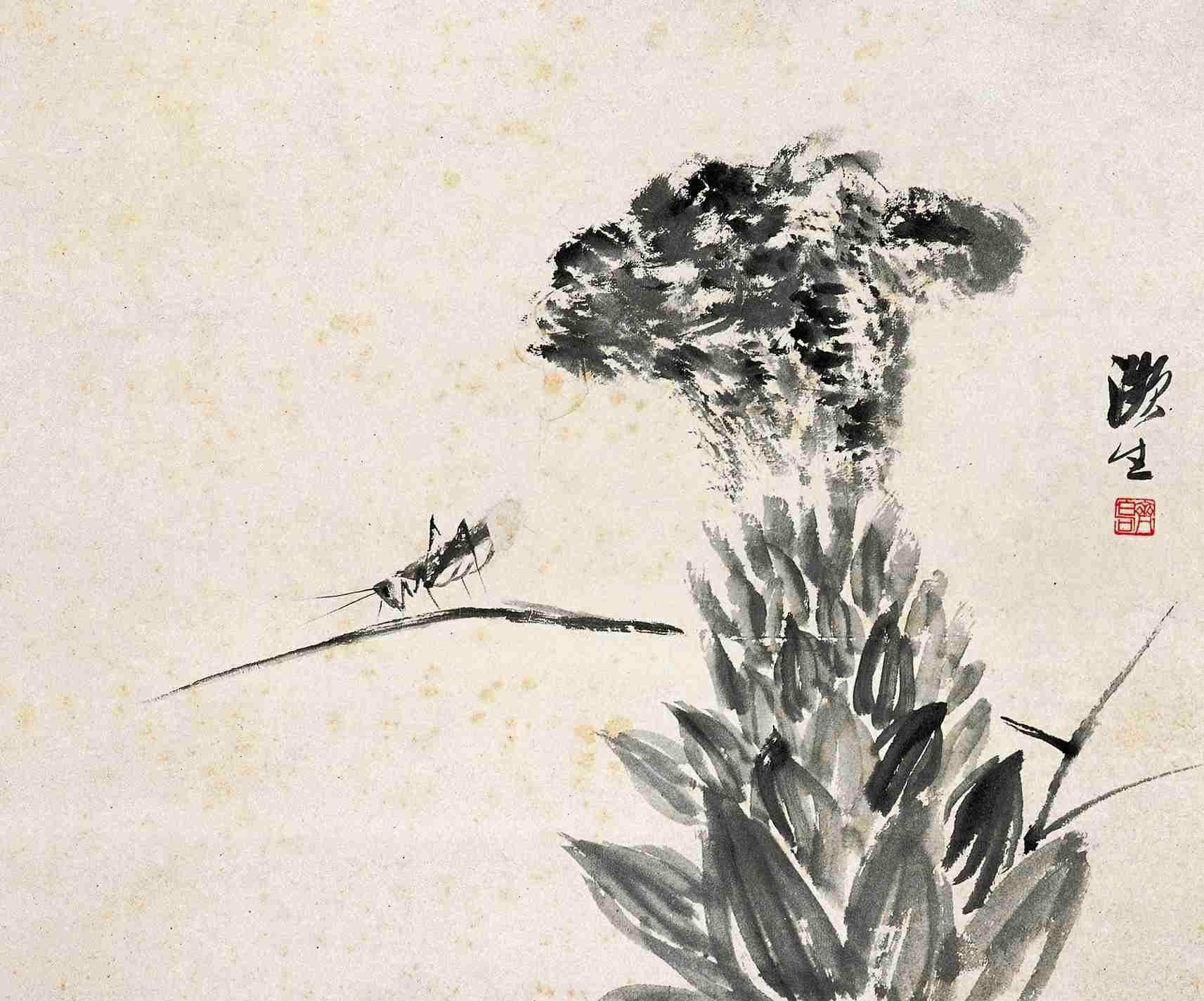 一五九 紡織娘(花鳥草蟲册之八)一九一七年 縱三九點五厘米 横四五點七厘米