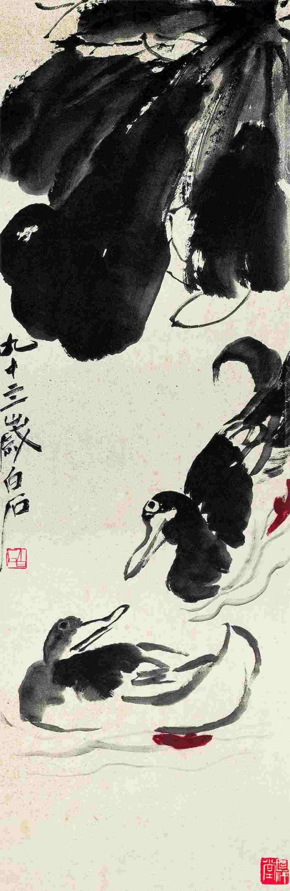 二一三 荷塘雙鴨圖 一九五四年 縱一〇〇點八厘米 横三三厘米