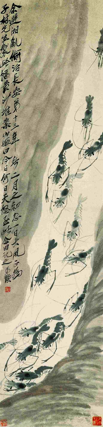 二二 山溪蝦戲圖 一九二九年 縱一三七厘米 橫三三點五厘米