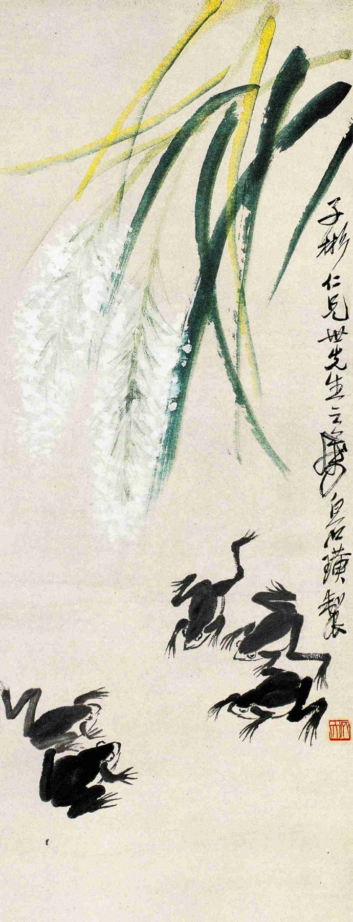 六四 蘆塘蛙戲 約二十世纪三十年代晚期 縱一〇五點五厘米 橫四〇厘米