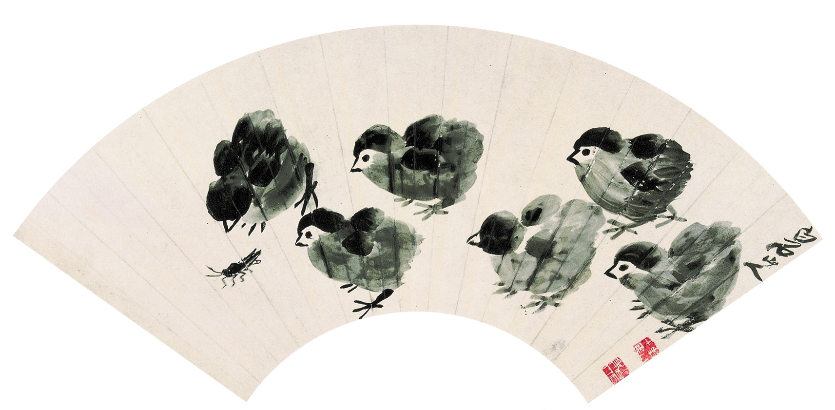 七六 雛鷄戲蟲(扇面)一九四○年 縱一七點五厘米 橫五三厘米