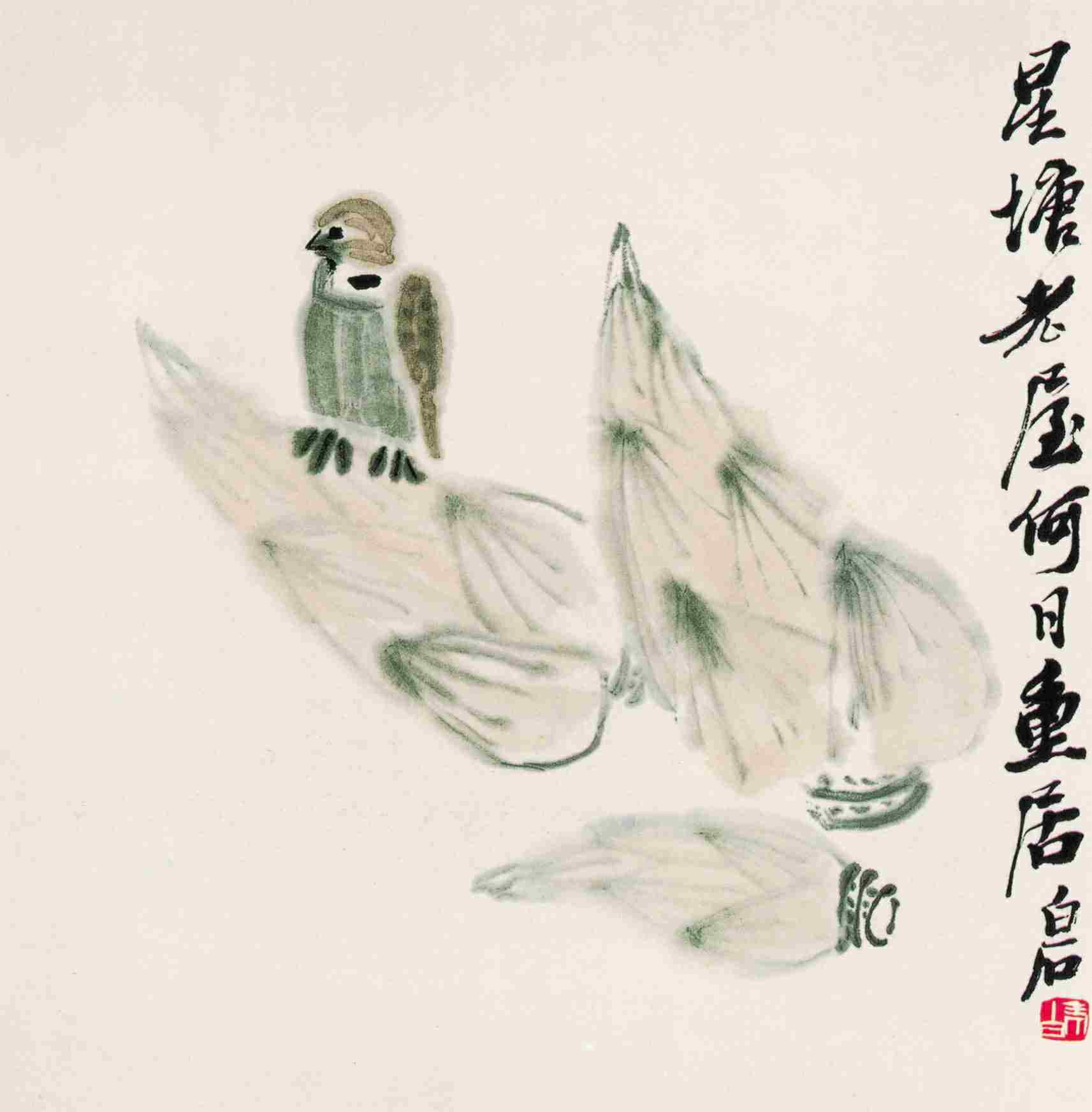 一三九 竹笋麻雀(蔬果動物册頁之三)一九四七年 縱三四厘米 横三四厘米