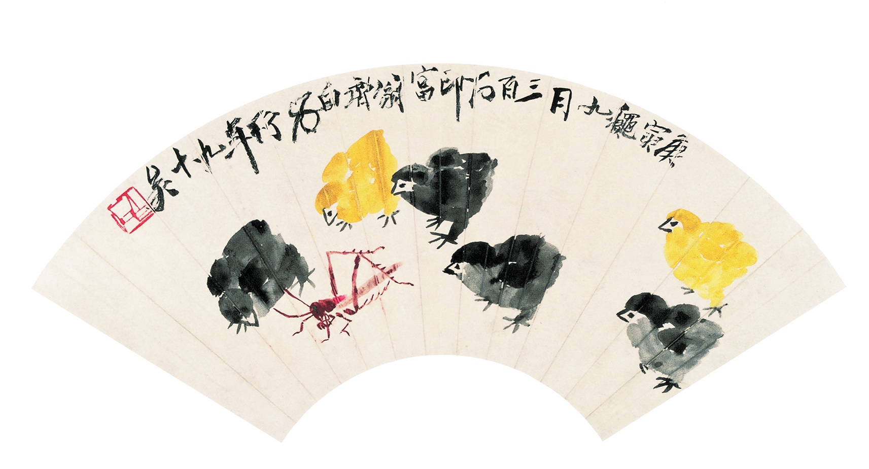 四三 雛鷄草蟲(扇面) 一九五〇年 縱二〇厘米 横五六厘米